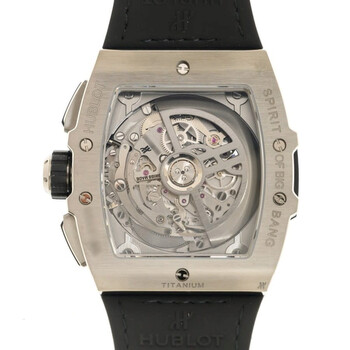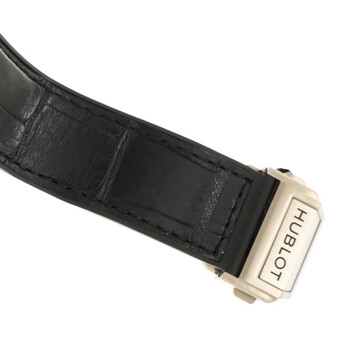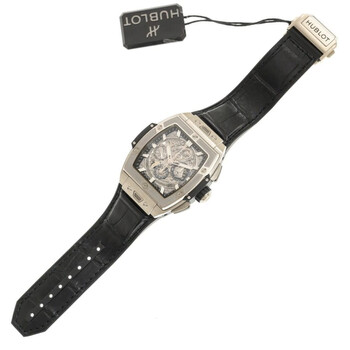 Grey titanium case with a black alligator band. Fixed grey titanium bezel. Transparent dial with silver-tone hands and index hour markers. Minute markers around the outer rim. Dial Type: Analog. Luminescent hands and markers. Chronograph - three sub-dials displaying: 60 second, 30 minute and 12 hour. Hublot Calibre HUB4700 Automatic movement, containing 31 Jewels, composed of 278 parts, bitting at 36000 vph, and has a power reserve of approximately 50 hours. Scratch resistant sapphire crystal. Transparent see through case back. Tonneau case shape, case size: 42 mm. Deployment with push button release clasp. Water resistant at 100 meters / 330 feet. Functions: chronograph, date, hour, minute, second. Additional Info: original box, international warranty card, manual (complete accessories). Big Bang Series. Luxury watch style. Watch label: Swiss Made. Hublot Big Bang Chronograph Automatic Men's Watch 642.NX.0170.LR.