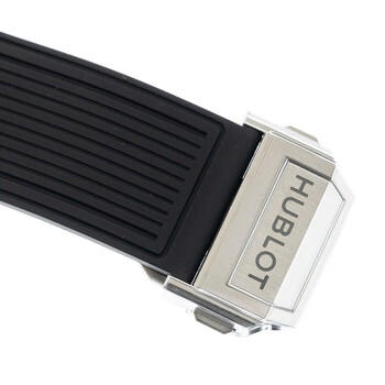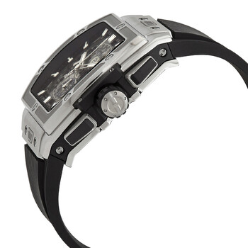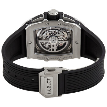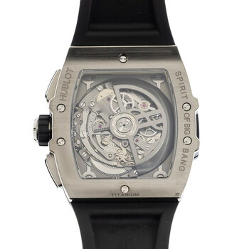 Grey titanium case with a black rubber strap. Fixed grey titanium bezel. Transparent dial with silver-tone hands and index hour markers. Minute markers around the outer rim. Dial Type: Analog. Luminescent hands and markers. Date display between 4 and 5 o'clock position. Chronograph - three sub-dials displaying: 60 second, 30 minute and 12 hour. Hublot Calibre HUB4700 Automatic movement, containing 31 Jewels, composed of 278 parts, bitting at 36000 vph, and has a power reserve of approximately 50 hours. Scratch resistant sapphire crystal. Transparent see through case back. Tonneau case shape, case size: 42 mm. Deployment with push button release clasp. Water resistant at 100 meters / 330 feet. Functions: chronograph, date, hour, minute, second. Additional Info: original box, international warranty card, manual (complete accessories). Big Bang Series. Luxury watch style. Watch label: Swiss Made. Hublot Big Bang Chronograph Automatic Men's Watch 642.NX.0170.RX.