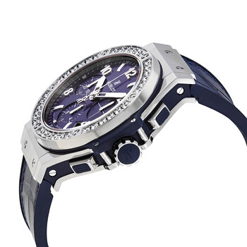 Stainless steel case with lateral blue inserts. Blue rubber strap with alligator leather top. Fixed stainless steel bezel set with 36 diamonds. Blue dial with luminous silver-tone hands and alternating Arabic numeral and index hour markers. Minute markers around the outer rim. Dial Type: Analog. Luminescent hands and markers. Date display between the 4 and 5 o'clock positions. Chronograph - three sub-dials displaying: 60 second, 30 minute and 12 hour. Hublot calibre HUB4100 automatic movement, based upon ETA 2894-2, containing 27 Jewels, composed of 252 parts, bitting at 28800 vph, and has a power reserve of approximately 42 hours. Scratch resistant sapphire crystal. Pull / push crown. Transparent case back. Round case shape. Case size: 41 mm. Case thickness: 12.75 mm. Band width: 22 mm. Fold over clasp with a push button release. Water resistant at 100 meters / 330 feet. Functions: chronograph, date, hour, minute, second. Additional Info: 36 brilliant cut diamonds (about 1.31 carats). Big Bang Series. Luxury watch style. Watch label: Swiss Made. Hublot Big Bang Chronograph Diamond Watch 341.SX.7170.LR.1204.