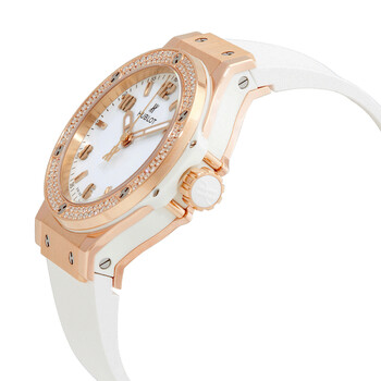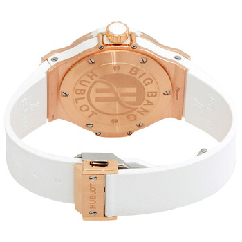 18 kt rose gold case with a white silicone bracelet. Fixed 18 kt rose gold bezel set with 126 diamonds. White dial with gold-tone hands and index and Arabic hour markers. Minute markers around outer rim. Dial Type: analog. Swiss quartz movement. Scratch resistant sapphire crystal. Gold and kevlar crown. Case diameter: 38 mm. Case thickness: 12 mm. Deployment clasp. Water resistant at 100 meters / 330 feet. Functions: hour, minute, second. Luxury watch style. Hublot Big Bang Diamond Ladies Watch 361PE2010LR1104.