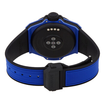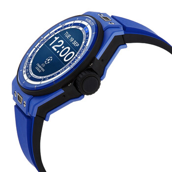 Blue ceramic case with a two-tone (black and blue) rubber strap. Fixed blue ceramic bezel. Digital dial with Arabic numeral hour markers. Minute markers around the outer rim. Dial Type: digital. Scratch resistant sapphire crystal. Round case shape, case size: 42 mm. Deployant clasp. Water resistant at 50 meters / 165 feet. Functions: hour, minute, second. Big Bang Series. Sport watch style. Watch label: Swiss Made. Hublot Big Bang e UEFA Champions League 44mml Men's Watch 450.EX.1100.RX.UCL23.