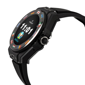 Black (microblasted and polished) ceramic case with a black lined rubber strap. Fixed black ceramic bezel. Digital dial. Dial Type: digital. Qualcomm® Snapdragon Wear™ 3100 quartz movement. Scratch resistant sapphire crystal. Solid case back. Round case shape. Case size: 42 mm. Deployment clasp. Water resistant at 30 meters / 100 feet. Functions: date, day of the week, hour, minute, second,accelerometer, gyroscope, microphone, dc motor (vibration), google play. Additional Info: limited edition of 1000 pieces. compatible with android 6.0 and above/ iphone 5s and above running ios12 and above. Big Bang E Uefa Euro 2020™ Series. Sport watch style. Hublot Big Bang E UEFA EURO 2020™ Quartz Digital Men's Watch 440.CI.1100.RX.EUR20.