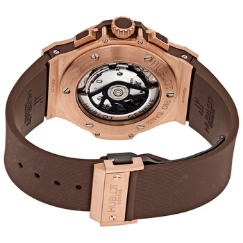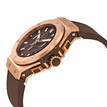 18kt rose gold case with a chocolate brown rubber strap. Fixed 18kt rose gold bezel. Chocolate dial with luminous rose gold hands and index hour markers. Minute markers around the outer rim. Dial Type: Analog. Date display between 4 and 5 o'clock position. Chronograph - three sub-dials displaying: 60 second, 30 minute and 1/10th of a second. Hublot calibre HUB 4100 automatic movement with a 42-hour power reserve. Scratch resistant sapphire crystal. Transparent case back. Round case shape. Case size: 44 mm. Case thickness: 14.5 mm. Deployant clasp. Water resistant at 100 meters / 330 feet. Functions: chronograph, date, hour, minute, second. Luxury watch style. Watch label: Swiss Made. Item Variations: 301 PC 3180 RC, 301-PC-3180-RC, 301/PC/3180/RC, 301PC3180RC. Hublot Big Bang Evolution Chronograph Automatic Men's Watch 301.PC.3180.RC.
