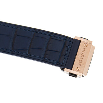 18kt rose gold case with a blue alligator gummy leather (rubber backed) strap. Fixed gold-tone diamond set bezel. Blue dial with gold-tone hands and index and Arabic numeral hour markers. Minute markers around the outer rim. Dial Type: Analog. Date display between 4 and 5 o'clock position. Hublot Calibre HUB4300 Automatic movement, based upon ETA 2894, containing 37 Jewels, composed of 278 parts, bitting at 28800 vph, and has a power reserve of approximately 42 hours. Scratch resistant sapphire crystal. Screw down crown. Solid case back. Round case shape, case size: 38 mm, case thickness: 14 mm. Band width: 22 mm, band length: 9 inches. Deployment clasp. Water resistant at 30 meters / 100 feet. Functions: chronograph, date, hour, minute, second. Luxury watch style. Watch label: Swiss Made. Hublot Big Bang Gold Blue Chronograph Automatic Diamond Ladies Watch 361.PX.7180.LR.1204.