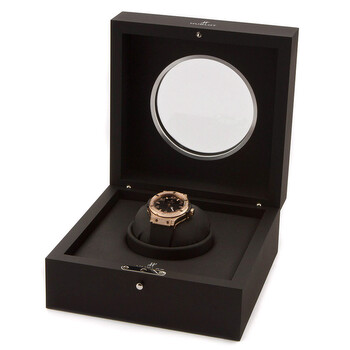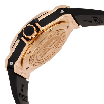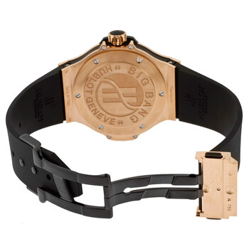 Polished 18 kt rose gold case set with 194 diamonds (0.82 ct) with a black lined rubber strap strap. Fixed bezel set with 126 diamonds (0.87 ct). Black dial with rose gold-tone hands and alternating stick and Arabic numeral hour markers. Minute markers around the outer rim. Dial Type: Analog. Luminescent hands and markers. Quartz movement. Hub2900 engine. Scratch resistant sapphire crystal. Solid case back. Case diameter: 38 mm. Round case shape. Deployment clasp with push button. Water resistant at 100 meters / 330 feet. Functions: hour, minute, second. Luxury watch style. Watch label: Swiss Made. Hublot Big Bang Gold Pave Diamond Black Dial 18 kt Rose Gold Ladies Watch 361.PX.1280.RX.1704.