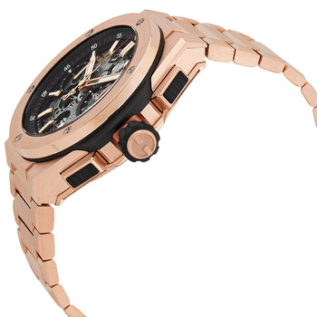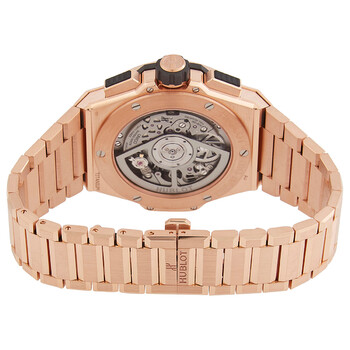 18kt rose gold case with a 18kt rose gold bracelet. Fixed 18kt rose gold bezel. Black (skeleton center) dial with luminous rose gold hands and index hour markers. Arabic numeral minute markers (at 5 minute intervals). Minute markers around the outer rim. Dial Type: Analog. Luminescent hands and markers. Date display at the 3 o'clock position. Small seconds sub-dial. Hublot calibre HUB1280 automatic movement, containing 43 Jewels, composed of 354 parts, bitting at 28800 vph, and has a power reserve of approximately 72 hours. Scratch resistant sapphire crystal. Screw down crown. Transparent case back. Round case shape. Case size: 42 mm. Case thickness: 14.5 mm. Fold over clasp with a push button release. Water resistant at 100 meters / 330 feet. Functions: chronograph, date, hour, minute, second. Big Bang Integral Series. Luxury watch style. Watch label: Swiss Made. Hublot Big Bang Integral Chronograph Automatic Men's Watch 451.OX.1180.OX.