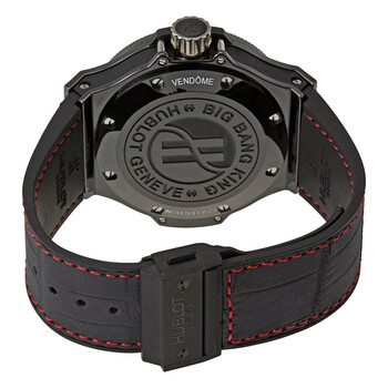 Black ceramic case with a black gummy alligator strap. Fixed black ceramic bezel. Black dial with luminous red hands and index hour markers. Minute markers around the outer rim. Dial Type: Analog. Luminescent hands and markers. Date display at the 3 o'clock position. Hublot calibre HUB1400 automatic movement with a 42-hour power reserve. Scratch resistant mineral crystal. Transparent case back. Case size: 48 mm. Round case shape. Band length: 8.5 inches. Deployment clasp. Water resistant at 300 meters / 1000 feet. Functions: date, hour, minute, second. Luxury watch style. Watch label: Swiss Made. Item Variations: 322 CI 1123 GR, 322-CI-1123-GR, 322/CI/1123/GR, 322CI1123GR. Hublot Big Bang King Black Dial Automatic Men's Watch 322.CI.1123.GR.