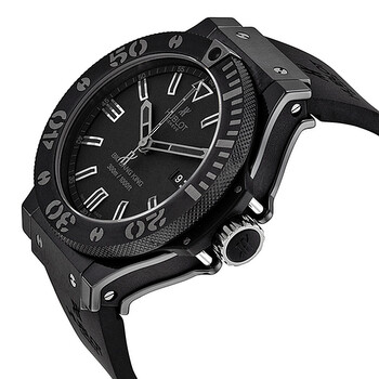 Black ceramic case with a black rubber strap. Uni-directional rotating black ceramic bezel. Black dial with silver-tone hands and index hour markers. Minute markers around the outer rim. Dial Type: Analog. Luminescent hands and markers. Date display at the 3 o'clock position. Automatic movement with 42 hour power reserve. Scratch resistant sapphire crystal. Screw down crown. Solid case back. Case diameter: 48 mm. Case thickness: 18 mm. Round case shape. Band width: 26 mm. Deployment clasp with push button. Water resistant at 300 meters / 1000 feet. Functions: date, hour, minute, second. Luxury watch style. Watch label: Swiss Made. Hublot Big Bang King Black Magic Automatic Black Ceramic Case Men's Watch 322-CK-1140-RX.