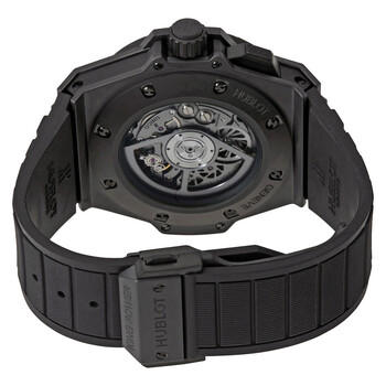 Black ceramic case with a black rubber strap. Fixed black ceramic and black rubber engraved with world time citie bezel. Multi-layered black skeleton dial with black skeleton hands. World time cities: London, Karachi, Tokyo, Auckland, Anchorage, New York. Dial Type: Analog. Luminescent hands and markers. Four 24 hour sub-dials. Hublot calibre HUB1220 automatic movement, containing 37 Jewels, bitting at 28800 vph, and has a power reserve of approximately 72 hours. Scratch resistant sapphire crystal. Pull / push crown. Transparent case back. Round case shape. Case size: 48 mm. Case thickness: 18 mm. Band width: 26 mm. Tang clasp. Water resistant at 100 meters / 330 feet. Functions: world time, GMT, second time zone, hour, minute, second. Big Bang King Power Unico Gmt Series. Travel watch style. Watch label: Swiss Made. Item Variations: 771 CI 1170 RX, 771-CI-1170-RX, 771/CI/1170/RX, 771CI1170RX. Hublot Big Bang King Power Unico GMT Skeleton Dial Ceramic Men's Watch 771.CI.1170.RX.