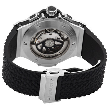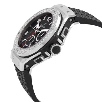 Stainless steel case with a black rubber strap. Fixed stainless steel bezel set with 114 diamonds. Black dial with luminous silver-tone skeleton hands and alternating Arabic numeral and index hour markers. Arabic numeral minute markers (at 5 minute intervals). Minute markers around the outer rim. Dial Type: Analog. Luminescent hands and markers. Date display between the 4 and 5 o'clock positions. Chronograph - three sub-dials displaying: 60 second, 30 minute and 12 hour. Hublot calibre HUB44 automatic movement, based upon ETA Valjoux 7750, containing 25 Jewels, composed of 252 parts, bitting at 28800 vph, and has a power reserve of approximately 42 hours. Scratch resistant sapphire crystal. Pull / push crown. Transparent case back. Round case shape. Case size: 44 mm. Case thickness: 14.5 mm. Band length: 8 inches. Fold over clasp. Water resistant at 100 meters / 330 feet. Functions: chronograph, date, hour, minute, second. Big Bang Series. Luxury watch style. Watch label: Swiss Made. Item Variations: 301.SX.130.RX.114, 301-SX-130-RX-114, 301/SX/130/RX/114, 301SX130RX114. Hublot Big Bang Men's Watch 301.SX.130.RX.114.