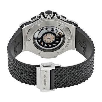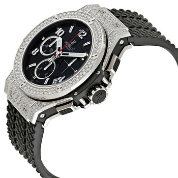 Silver-tone stainless steel case with a black rubber strap. Fixed silver-tone diamond set bezel. Black dial with luminous hands hands and Arabic numeral and index hour markers. Minute markers around the outer rim. Dial Type: Analog. Luminescent hands and markers. Date display between the 4 and 5 o'clock positions. Chronograph - three sub-dials displaying: 60 second, 30 minute and 12 hour. Hublot Calibre HUB4300 Automatic movement, based upon ETA 2894, containing 37 Jewels, composed of 278 parts, bitting at 28800 vph, and has a power reserve of approximately 42 hours. Scratch resistant sapphire crystal. Pull / push crown. Transparent case back. Round case shape, case size: 41 mm, case thickness: 14 mm. Band width: 24 mm, band length: 8 inches. Deployment clasp. Water resistant at 100 meters / 330 feet. Functions: chronograph, date, hour, minute, second. Big Bang Series. Luxury watch style. Watch label: Swiss Made. Item Variations: 341SX130RX174. Hublot Big Bang Men's Watch 341.SX.130.RX.174.