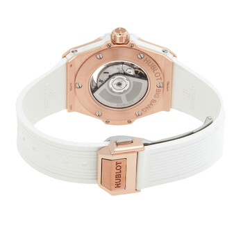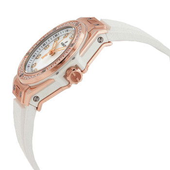 18k king gold case with a white rubber strap. Fixed 18k king gold bezel set with 36 diamonds for 0.76ct. White dial with rose gold-tone hands and diamond hour markers. Arabic numeral minute markers (at 5 minute intervals). Dial Type: Analog. Luminescent hands. Date display at the 3 o'clock position. Hublot Calibre HUB1120 Automatic movement, containing 18 Jewels, composed of 65 parts, bitting at 28800 vph, and has a power reserve of approximately 40 hours. Scratch resistant sapphire crystal. Pull / push crown. Transparent case back. Round case shape, case size: 33 mm. Deployant buckle clasp. Water resistant at 100 meters / 330 feet. Functions: date, hour, minute, second. Big Bang One Click Series. Dress watch style. Watch label: Swiss Made. Hublot Big Bang One Click Automatic Diamond White Dial Ladies Watch 485.OE.2210.RW.1204.