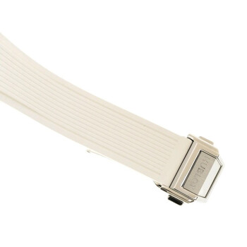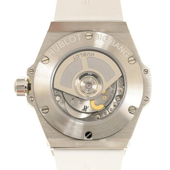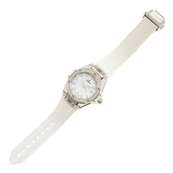 Polished and satin-finished stainless steel case with a white rubber strap. Fixed silver-tone stainless steel bezel set with 36 diamonds for 0.76ct. White dial with silver-tone hands and diamond hour markers. Arabic numeral minute markers (at 5 minute intervals). Dial Type: Analog. Luminescent hands. Date display at the 3 o'clock position. Hublot Calibre HUB1120 Automatic movement, containing 18 Jewels, composed of 65 parts, bitting at 28800 vph, and has a power reserve of approximately 40 hours. Scratch resistant sapphire crystal. Transparent case back. Round case shape, case size: 33 mm. Deployant buckle clasp. Water resistant at 100 meters / 330 feet. Functions: date, hour, minute, second. Big Bang Series. Luxury watch style. Watch label: Swiss Made. Hublot Big Bang One Click Automatic Diamond White Dial Ladies Watch 485.SE.2210.RW.1204.