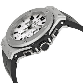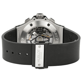 Platinum case with a black rubber strap. Fixed platinum bezel. Silver / grey dial with skeleton hands and alternating Arabic numeral and index hour markers. Minute markers around the outer rim. Dial Type: Analog. Date displays between the 4 and 5 o'clock positions. Chronograph - three sub-dials displaying: 60 second, 30 minute and 12 hour. Automatic movement with a 42 hour power reserve. Scratch resistant sapphire crystal. Pull / push crown. Transparent case back. Case diameter: 44 mm. Case thickness: 14.5 mm. Round case shape. Deployment clasp. Water resistant at 100 meters / 330 feet. Functions: chronograph, date, hour, minute, second. Additional Info: chronograph; date displays between 4 and 5 o'clock positions. Dress watch style. Watch label: Swiss Made. Hublot Big Bang Platinum Men's Watch 301.TI.450.RX.