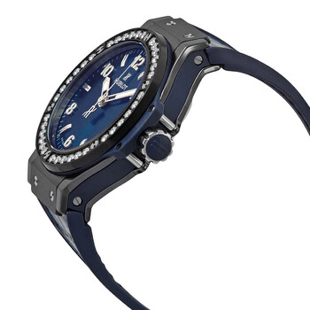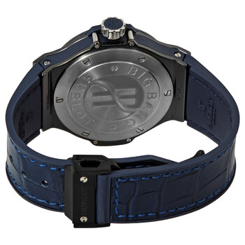 Black ceramic case with a blue leather strap. Fixed black ceramic bezel set with 36 diamonds. Blue dial with luminous silver-tone hands and Arabic numeral hour markers. Arabic numeral minute markers (at 5 minute intervals). Minute markers around the outer rim. Dial Type: Analog. Luminescent hands and markers. Hublot calibre HUB 2900 quartz movement. Scratch resistant sapphire crystal. Pull / push crown. Solid case back. Round case shape. Case size: 38 mm. Case thickness: 11.90 mm. Deployment clasp with a push button release. Water resistant at 100 meters / 330 feet. Functions: hour, minute, second. Additional Info: original box, international warranty card, manual (complete accessories). Big Bang Series. Luxury watch style. Watch label: Swiss Made. Hublot BIG BANG Quartz Diamond Blue Dial Unisex Watch 361.CM.7170.LR.1204.