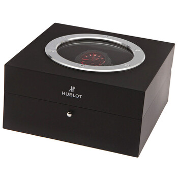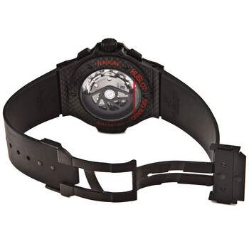 Black carbon fiber case with a black rubber strap. Fixed black carbon fiber bezel. Black carbon fiber dial with red-toned skeleton hands and index hour markers. Minute markers around the outer rim. Dial Type: Analog. Luminescent hands and markers. Date display between 4 and 5 o'clock position. Chronograph - three sub-dials displaying: 60 second, 30 minute and 12 hour. Hublot Calibre HUB4104 automatic movement with a 42-hour power reserve. Scratch resistant sapphire crystal. Transparent case back. Round case shape. Case size: 44 mm. Deployment clasp. Water resistant at 100 meters / 330 feet. Functions: chronograph, date, hour, minute, second. Luxury watch style. Watch label: Swiss Made. Item Variations: 301 QX 1734 RX, 301-QX-1734-RX, 301/QX/1734/RX, 301QX1734RX. Hublot Big Bang Red Magic Automatic Men's Watch 301QX1734RX.