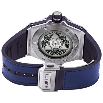 Polished titanium case with a blue leather-rubber strap. Polished titanium bezel. Blue dial with octagonal skeleton hands. Dial Type: Analog. Hublot Calibre HUB1213 automatic movement with a 72-hour power reserve. Scratch resistant sapphire crystal. Hexagon case shape. Case size: 45 mm. Deployant clasp. Water resistant at 100 meters / 330 feet. Functions: hour, minute, second. Additional Info: limited edition of 200 pieces. Luxury watch style. Watch label: Swiss Made. Hublot Big Bang Sang Bleu Automatic Blue Dial Men's Limited Edition Watch 415.NX.7179.VR.MXM18.