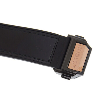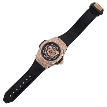 18kt king gold diamond set case with a black rubber strap. Set with 48 diamonds for 0.70ct diamond set bezel. Black dial with gold-tone hands and Arabic numeral hour markers. Dial Type: Analog. Luminescent hands. Hublot Calibre HUB1710 automatic movement with a 50-hour power reserve. Scratch resistant sapphire crystal. Transparent case back. Hexagon case shape. Case size: 39 mm. 18k king gold and black-plated titanium deployant clasp. Water resistant at 100 meters / 330 feet. Functions: hour, minute, second. Luxury watch style. Watch label: Swiss Made. Hublot Big Bang Sang Bleu Automatic Diamond Black Dial Ladies Watch 465.OS.1118.VR.1704.MXM18.