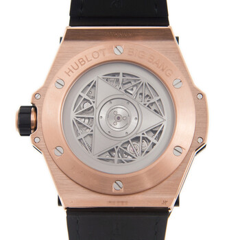 Gold-tone 18kt rose gold case with a black rubber strap. Fixed gold-tone diamond set bezel. Black dial with gold-tone hands. Dial Type: Analog. Hublot Calibre HUB1213 automatic movement with a 72-hour power reserve. Scratch resistant sapphire crystal. Screw down crown. Transparent case back. Hexagon case shape. Case size: 45 mm. Deployment clasp. Water resistant at 100 meters / 330 feet. Functions: hour, minute, second. Dress watch style. Watch label: Swiss Made. Hublot Big Bang Sang Bleu Automatic Diamond Black Dial Watch 415.OX.1118.VR.1704.MXM17.