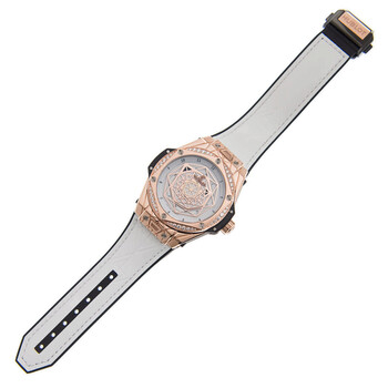 18kt king gold case with a white rubber strap. Set with 48 diamonds for 0.70ct 18k king gold bezel. White dial with Arabic numeral hour markers. Dial Type: Analog. Luminescent hands. Hublot Calibre HUB1710 Automatic movement, based upon Zenith Elite 670, containing 27 Jewels, bitting at 28800 vph, and has a power reserve of approximately 50 hours. Scratch resistant sapphire crystal. Transparent case back. Hexagon case shape. Case size: 39 mm. 18k king gold and black-plated titanium deployant clasp. Water resistant at 100 meters / 330 feet. Functions: hour, minute, second. Additional Info: limited to 100 pieces. Luxury watch style. Watch label: Swiss Made. Hublot Big Bang Sang Bleu Automatic White Dial Ladies Watch 465.OS.2028.VR.1204.MXM19.
