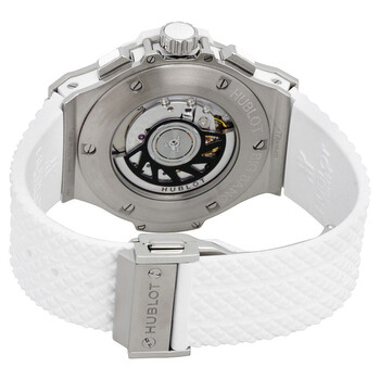 Stainless steel case with a white rubber strap. Fixed white ceramic bezel. White dial with silver-tone hands and alternating index and Arabic numeral hour markers. Arabic numeral minute markers (at 5 minute intervals). Minute markers around the outer rim. Dial Type: Analog. Luminescent hands. Date display between the 4 and 5 o'clock positions. Chronograph - three sub-dials displaying: 60 second, 30 minute and 12 hour. Hublot calibre HUB1145 automatic movement, containing 37 Jewels, bitting at 28800 vph, and has a power reserve of approximately 42 hours. Scratch resistant anti-reflective sapphire crystal. Pull / push crown. Transparent sapphire case back. Round case shape. Case size: 41 mm. Deployment clasp. Water resistant at 30 meters / 100 feet. Functions: chronograph, date, hour, minute, second. Big Bang Steel White Series. Luxury watch style. Watch label: Swiss Made. Item Variations: 342 SE 230 RW, 342-SE-230-RW, 342/SE/230/RW, 342SE230RW. Hublot Big Bang Steel White Automatic White Dial Men's Watch 342.SE.230.RW.