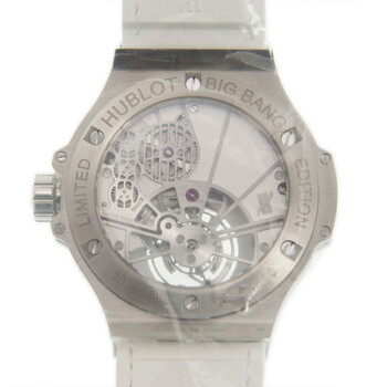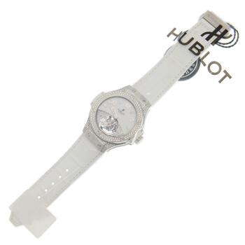 Silver-tone stainless steel case with a white alligator band. Fixed silver-tone bezel with diamond set stainless steel. White dial with silver-tone hands and Arabic numeral hour markers. Dial Type: Analog. One subdial displaying: tourbillon. Hublot Calibre HUB6004 hand wind movement with a 42-hour power reserve. Scratch resistant sapphire crystal. Screw down crown. Transparent see through case back. Round case shape, case size: 41 mm. Deployment with push button release clasp. Water resistant at 30 meters / 100 feet. Functions: tourbillon, hour, minute. Additional Info: original box, international warranty card, manual (complete accessories). Big Bang Series. Luxury watch style. Watch label: Swiss Made. Item Variations: 345 SE 2010 LR 1704, 345-SE-2010-LR-1704, 345/SE/2010/LR/1704, 345SE2010LR1704. Hublot BIG BANG Tourbillon Hand Wind Diamond White Dial Men's Watch 345.SE.2010.LR.1704.