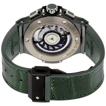 Black ceramic case with a green alligator gummy leather strap (rubber backed). Fixed black PVD coated 18kt white gold bezel set with green sapphire baguettes. Dark green dial with black skeleton hands and alternating index and Arabic numeral hour markers. Minute markers around the outer rim. Dial Type: Analog. Date display between the 4 and 5 o'clock positions. Chronograph - three sub-dials displaying: 60 second, 30 minute and 12 hour. Automatic movement with a 42-hour power reserve. Scratch resistant sapphire crystal. Pull / push crown. Transparent case back. Case size: 41 mm. Case thickness: 14 mm. Round case shape. Band width: 22.9 mm. Band length: 9 inches. Deployment clasp. Water resistant at 30 meters / 100 feet. Functions: chronograph, date, hour, minute, second. Luxury watch style. Watch label: Swiss Made. Item Variations: 341 CV 5290 LR 1917, 341-CV-5290-LR-1917, 341/CV/5290/LR/1917, 341CV5290LR1917. Hublot Big Bang Tutti Frutti Automatic Dark Green Unisex Watch 341.CV.5290.LR.1917.