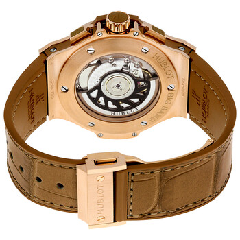 18kt rose gold case with a tan gummy leather strap. Fixed 18kt rose gold bezel set with andalusite baguettes. Tan dial with skeleton hands and alternating Arabic numeral and index hour markers. Minute markers around the outer rim. Dial Type: Analog. Date display between 4 and 5 o'clock position. Chronograph - three sub-dials displaying: 60 second, 30 minute and 12 hour. Automatic movement with a 42 hour power reserve. Scratch resistant sapphire crystal. Case diameter: 41 mm. Round case shape. Deployment clasp. Water resistant at 100 meters / 330 feet. Functions: chronograph, date, hour, minute, second. Luxury watch style. Watch label: Swiss Made. Hublot Big Bang Tutti Frutti Tan Dial Chronograph 18kt Rose Gold Unisex Watch 341PA5390LR1918.