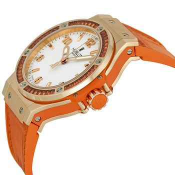 18kt rose gold case with a orange gummy leather strap. Fixed 18kt rose gold bezel set wtih orange sapphires. White dial with skeleton hands and alternating Arabic numeral and index hour markers. Minute markers around the outer rim. Dial Type: Analog. Swiss quartz movement. Scratch resistant sapphire crystal. Pull / push crown. Solid case back. Case diameter: 38 mm. Round case shape. Deployment clasp. Water resistant at 100 meters / 330 feet. Functions: hour, minute, second. Luxury watch style. Watch label: Swiss Made. Hublot Big Bang Tutti Frutti White Dial 18kt Rose Gold Ladies Watch 361.PO.2010..