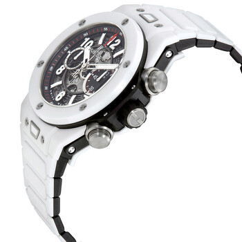 White ceramic case with a white ceramic bracelet. Fixed white ceramic bezel. Skeleton dial with silver-tone hands and index-Arabic numerals hour markers. Minute markers around the outer rim. Dial Type: Analog. Luminescent hands and markers. Date display at the 3 o'clock position. Chronograph - two sub-dials displaying: 60 second and 60 minute. Hublot Calibre HUB1242 Automatic movement, based upon Hublot HUB1240, containing 38 Jewels, composed of 330 parts, bitting at 28800 vph, and has a power reserve of approximately 72 hours. Scratch resistant sapphire crystal. Skeleton transparent exhibition see through case back. Round case shape, case size: 45 mm. Deployment clasp. Water resistant at 100 meters / 330 feet. Functions: chronograph, date, hour, minute, second. Big Bang Unico Series. Luxury watch style. Watch label: Swiss Made. Hublot Big Bang Unico Automatic Men's White Ceramic Watch 411.HX.1170.HX.