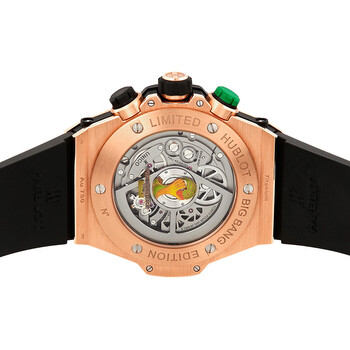 Limited edition of 100 pieces, FIFA World Cup Brazil Big Bang Unico. 18kt rose gold case with a black rubber strap. Fixed black aluminum and carbon fiber bezel. Black dial with yellow, green and rose gold-tone hands and inex and Arabic numeral hour markers. Minute markers around the outer rim. Dial Type: Analog. Luminescent hands and markers. Automatic movement. Scratch resistant anti-reflective sapphire crystal. Transparent sapphire case back. Case diameter: 45 mm. Round case shape. Deployment clasp. Water resistant at 100 meters / 330 feet. Functions: hour, minute, second. Additional Info: features a colorful 2014 FIFA World Cup theme. Official 2014 FIFA World Cup brazil printed logo on caseback. Swiss Made. Hublot Big Bang Unico Bi-Retrograde FIFA World Cup Rose Gold Men's Watch 412OQ1128RX.