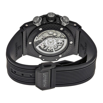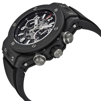 Black carbon fiber case with a black rubber strap. Fixed black carbon fiber and aluminum bezel. Skeleton dial with luminous silver-tone hands and alternating index and Arabic numeral hour markers. Arabic numeral minute markers (at 5 minute intervals). Minute markers around the outer rim. Dial Type: Analog. Luminescent hands and markers. Date display at the 3 o'clock position. Chronograph - two sub-dials displaying: 60 second and 30 minute. Hublot calibre HUB1242 automatic movement, based upon Hublot HUB1240, containing 38 Jewels, composed of 330 parts, bitting at 28800 vph, and has a power reserve of approximately 72 hours. Scratch resistant anti-reflective sapphire crystal. Screw down crown. Transparent case back. Round case shape. Case size: 45 mm. Band width: 23 mm. Band length: 8 inches. Deployment clasp. Water resistant at 100 meters / 330 feet. Functions: chronograph, flyback, column wheel, date, hour, minute, second. Big Bang Unico Series. Luxury watch style. Watch label: Swiss Made. Item Variations: 411 QX 1170 RX, 411-QX-1170-RX, 411/QX/1170/RX, 411QX1170RX. Hublot Big Bang Unico Carbon Automatic Skeletal Dial Men's Watch 411.QX.1170.RX.