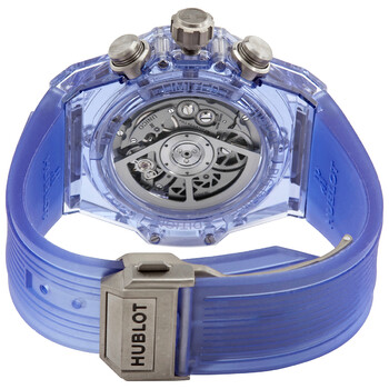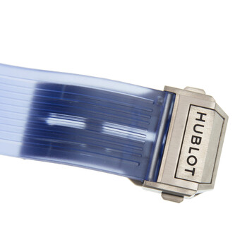 Transparent blue sapphire crystal case with a transparent blue rubber strap. Fixed transparent blue sapphire crystal bezel. Transparent composite resin skeleton dial with luminous silver-tone hands and alternating Arabic numeral and index hour markers. Minute markers around the outer rim. Dial Type: Analog. Luminescent hands and markers. Date display at the 3 o'clock position. Chronograph - two sub-dials displaying: 60 second and 60 minute. Hublot calibre HUB1242 automatic movement, based upon Hublot HUB1240, containing 38 Jewels, composed of 330 parts, bitting at 28800 vph, and has a power reserve of approximately 72 hours. Scratch resistant sapphire crystal. Screw down crown. Transparent case back. Round case shape. Case size: 45 mm. Fold over clasp with a push button release. Water resistant at 100 meters / 330 feet. Functions: chronograph, column wheel, flyback, date, hour, minute, second. Big Bang Unico Series. Luxury watch style. Watch label: Swiss Made. Hublot Big Bang Unico Chronograph Automatic Men's Watch 411.JL.4809.RT.