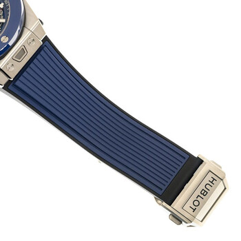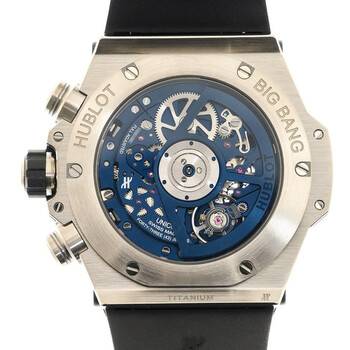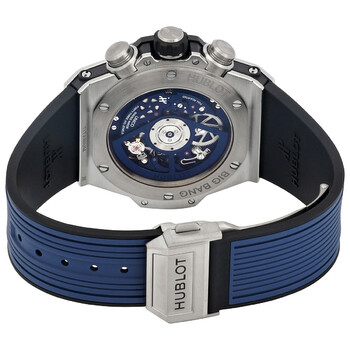 Silver-tone titanium case with a blue rubber strap. Fixed silver-tone bezel. Matte blue skeleton dial with silver-tone hands and Arabic numeral, index hour markers. Dial Type: Analog. Luminescent hands and markers. Date display at the 3 o'clock position. Chronograph - sub-dials displaying: 60 minutes. Hublot Calibre HUB1280 Automatic movement, containing 43 Jewels, composed of 354 parts, bitting at 28800 vph, and has a power reserve of approximately 72 hours. Scratch resistant sapphire crystal. Screw down crown. Transparent see through case back. Round case shape, case size: 44 mm. Deployant buckle clasp. Water resistant at 100 meters / 330 feet. Functions: chronograph, date, hour, minute, second. Big Bang Unico Series. Watch label: Swiss Made. Hublot Big Bang Unico Chronograph Automatic Men's Watch 421.NL.5170.RX.