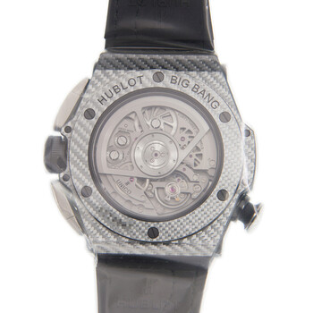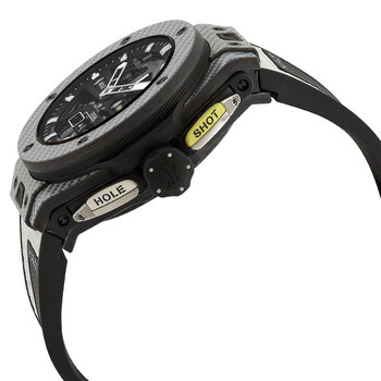 Big Bang Unico Golf carries Hublot's MHUB1580 automatic movement, containing 43 Jewels, bitting at 28800 vph, and has a power reserve of approximately 72 hours, which has been specially created to allow golfers to calculate their scores on the course. The chronograph features return-to-zero heart piece cams that ensure the precision of the counting mechanism. Counts dot the dial, from which various pushers jut out. The putter-shaped pusher at 2 o'clock activates the mechanism to display the tally of strokes, while the one at 4 o'clock resets the counter and lets the wearer move to the next holeCarbon fiber and grey texalium upper layer case with a white leather strap. Fixed grey carbon fiber bezel. Silver-tone hands and index hour markers. Date display at the 3 o'clock position. Hublot Calibre MHUB 1580 automatic movement with a 72-hour power reserve. Scratch resistant sapphire crystal. Screw down crown. Transparent case back. Round case shape, case size: 45 mm, case thickness: 18.1. Fold over clasp. Functions: hours, minutes, seconds, date, chronograph. Watch label: Swiss Made.