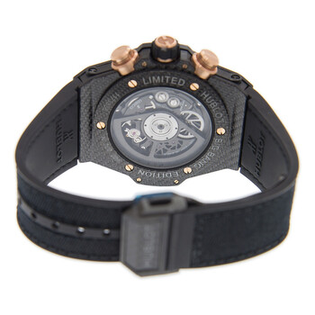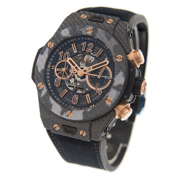 Carbon fiber case with a black rubber strap. Fixed black carbon fiber bezel. Black dial with gold-tone hands and Arabic numeral and index hour markers. Dial Type: Analog. Date display at the 3 o'clock position. Chronograph - two sub-dials displaying: 60 second and 60 minute. Hublot Calibre HUB1242 automatic movement with a 72-hour power reserve. Scratch resistant sapphire crystal. Case size: 45 mm. Round case shape. Carbon fiber and black-plated titanium deployant buckle clasp. Water resistant at 100 meters / 330 feet. Functions: chronograph, column wheel, flyback, date, hour, minute, second. Luxury watch style. Watch label: Swiss Made. Hublot Big Bang Unico Italia Independent Black Camo Watch 411.YT.1198.NR.ITI16.