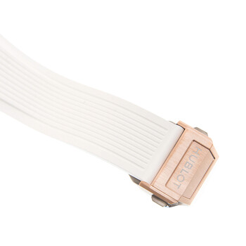 Polished 18k king gold case with a white rubber strap. Fixed polished 18k king gold bezel. Transparent dial with rose gold hands and index-Arabic numerals hour markers. Minute markers around the outer rim. Dial Type: Analog. Luminescent hands and markers. Date display at the 3 o'clock position. Chronograph - two sub-dials displaying: 60 minute and 60 second. Hublot Calibre HUB1280 automatic movement with a 72-hour power reserve. Scratch resistant sapphire crystal. Screw down crown. Transparent case back. Round case shape. Case size: 42 mm. Deployant buckle clasp. Water resistant at 100 meters / 330 feet. Functions: chronograph, column wheel, hour, minute, second. Additional Info: original box, international warranty card, manual (complete accessories). Luxury watch style. Watch label: Swiss Made. Hublot Big Bang Unico King Gold Chronograph Automatic Men's Watch 441.OE.2010.RW.