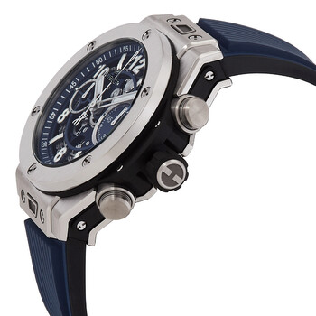 Silver-tone polished titanium case with a black, blue rubber strap. Fixed silver-tone titanium bezel. Matte blue skeleton dial with silver-tone hands and Arabic numeral, index hour markers. Dial Type: Analog. Luminescent hands and markers. Date display at the 3 o'clock position. Chronograph - sub-dials displaying: 60 minutes, seconds. Hublot Calibre HUB1280 Automatic movement, containing 43 Jewels, composed of 354 parts, bitting at 28800 vph, and has a power reserve of approximately 72 hours. Scratch resistant sapphire crystal. Transparent see through case back. Round case shape, case size: 42 mm, case thickness: 14 mm. Folding clasp. Water resistant at 100 meters / 330 feet. Functions: date, hour, minute, second. Big Bang Unico Series. Watch label: Swiss Made. Hublot Big Bang Unico Automatic Men's Watch 441.NX.5171.RX.