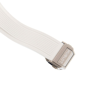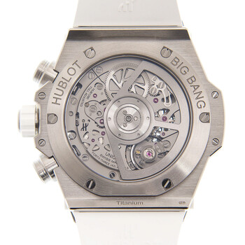 Grey titanium case with a white (structured lined) rubber strap. Fixed grey titanium bezel. Transparent dial with silver-tone hands and alternating index and Arabic numerals hour markers. Minute markers around the outer rim. Dial Type: Analog. Luminescent hands and markers. Date display at the 3 o'clock position. Chronograph - two sub-dials displaying: 60 minute and 60 second. Hublot calibre HUB1280 automatic movement with a 72-hour power reserve. Scratch resistant sapphire crystal. Screw down crown. Transparent case back. Round case shape. Case size: 42 mm. Deployant clasp. Water resistant at 100 meters / 330 feet. Functions: chronograph, date, hour, minute, second. Luxury watch style. Watch label: Swiss Made. Hublot Big Bang Unico Titanium Chronograph Automatic Men's Watch 441.NE.2010.RW.