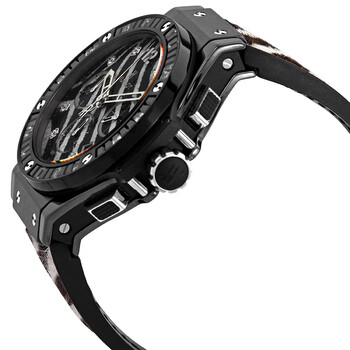 Black (satin-finished) ceramic case with a zebra-patterned (calfskin) leather strap. Fixed black-plated bezel set with 48 black spinels and topazes. Zebra-patterened dial with skeleton hands and diamond hour markers. Arabic numeral appears at the 12 o'clock position. Arabic numeral minute markers (at 5 minute intervals). Minute markers around the outer rim. Dial Type: Analog. Date display between the 4 and 5 o'clock positions. Chronograph - three sub-dials displaying: 60 second, 30 minute and 12 hour. Hublot calibre HUB4300 automatic movement, based upon ETA 2894, containing 37 Jewels, composed of 278 parts, bitting at 28800 vph, and has a power reserve of approximately 42 hours. Scratch resistant sapphire crystal. Screw down crown. Round case shape, case size: 41 mm. Deployment clasp. Water resistant at 100 meters / 330 feet. Functions: chronograph, date, hour, minute, second. Big Bang Zebra Series. Luxury watch style. Watch label: Swiss Made. Item Variations: 341 CV 7517 VR 1975, 341-CV-7517-VR-1975, 341/CV/7517/VR/1975, 341CV7517VR1975. Hublot Big Bang Zebra Diamond Dial Black Ceramic Chronograph Ladies Watch 341CV7517VR1975.