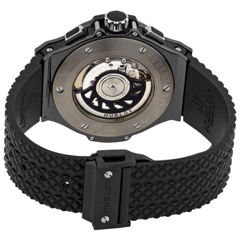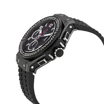 Black ceramic case with a black rubber strap. Fixed black PVD bezel set with 114 diamonds. Black dial with luminous silver-tone hands and alternating Arabic numeral and index hour markers. Arabic numeral minute markers (at 5 minute intervals). Minute markers around the outer rim. Dial Type: Analog. Luminescent hands and markers. Date display between the 4 and 5 o'clock positions. Chronograph - three sub-dials displaying: 12 hour, 30 minute and 1/4th of a second. Hublot alibre HUB4300 automatic movement, based upon ETA 2894, containing 37 Jewels, composed of 278 parts, bitting at 28800 vph, and has a power reserve of approximately 42 hours. Scratch resistant sapphire crystal. Pull / push crown. Transparent (see through) case back. Round case shape. Case size: 41 mm. Fold over clasp. Water resistant at 100 meters / 330 feet. Functions: chronograph, date, hour, minute, second. Big Bang Black Magic Series. Luxury watch style. Watch label: Swiss Made. Item Variations: 342 CV 130 RX 114, 342-CV-130-RX-114, 342/CV/130/RX/114, 342CV130RX114. Hublot Black Magic Automatic Black Rubber Men's Watch 342.CV.130.RX.114.