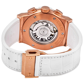 18kt rose gold case with a white (alligator) leather strap. Fixed 18kt rose gold bezel set with diamonds. The bezel is set on a white resin ring (lugs). White dial with rose gold hands and index hour markers. Minute markers around the outer rim. Dial Type: Analog. Date display above the 6 o'clock position. Chronograph - two sub-dials displaying: 60 second and 30 minute. Hublot calibre HUB1153 automatic movement, containing 35 Jewels, composed of 155 parts, bitting at 28800 vph, and has a power reserve of approximately 42 hours. Scratch resistant sapphire crystal. Pull / push crown. Transparent case back. Round case shape. Case size: 42 mm. Deployment clasp with a push button release. Water resistant at 50 meters / 165 feet. Functions: chronograph, date, hour, minute, second. Luxury watch style. Watch label: Swiss Made. Item Variations: 541 OE 2080 LR 1104, 541-OE-2080-LR-1104, 541/OE/2080/LR/1104, 541OE2080LR1104. Hublot Classic Fusion 18kt Rose Gold Diamonds Chronograph Automatic Ladies Watch 541.OE.2080.LR.1104.