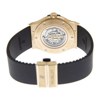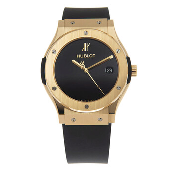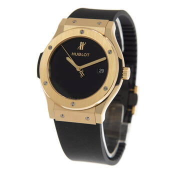 18kt yellow gold case with a black rubber strap. Fixed 18kt yellow gold bezel. Black dial with gold-tone hands. Dial Type: Analog. Date display at the 3 o'clock position. Hublot Calibre HUB1112 Automatic movement, based upon Sellita SW300-1, containing 25 Jewels, composed of 63 parts, bitting at 28800 vph, and has a power reserve of approximately 42 hours. Scratch resistant sapphire crystal. Screw down crown. Transparent see through case back. Round case shape, case size: 45 mm. Deployment clasp. Water resistant at 50 meters / 165 feet. Functions: date, hour, minute, second. Classic Fusion Series. Luxury watch style. Watch label: Swiss Made. Hublot Classic Fusion 40 Years Anniversary Automatic Black Dial Men's Watch 511.VX.1280.RX.MDM40.