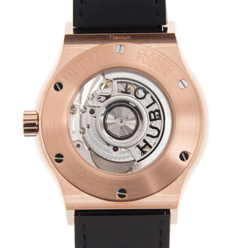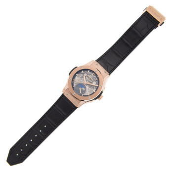 Rose 18kt king gold case with a black alligator leather strap. Fixed rose 18k king gold bezel. Silver-tone dial with gold-tone hands and index hour markers. Minute markers around the outer rim. Dial Type: Analog. Complete calendar. Three sub-dials displaying: month, day, date/moonphase. Hublot Calibre HUB1131 Automatic movement, containing 25 Jewels, composed of 134 parts, bitting at 28800 vph, and has a power reserve of approximately 42 hours. Scratch resistant sapphire crystal. Transparent case back. Round case shape, case size: 42 mm. Water resistant at 50 meters / 165 feet. Functions: full calendar, moon phase, month, date, day, hour, minute, second. Classic Fusion Aerofusion Series. Luxury watch style. Watch label: Swiss Made. Hublot Classic Fusion Aerofusion Moonphase King Watch 547.OX.0180.LR.
