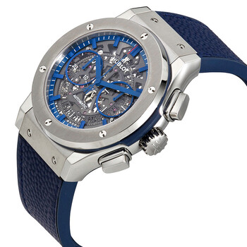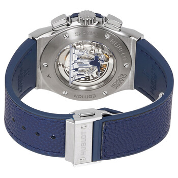 Titanium case with a blue leather (inner rubber) strap. Fixed titanium bezel. Skeleton dial with blue hands and index hour markers. Minute markers around the outer rim. Dial Type: Analog. Date display at the 6 o'clock position. Chronograph - two sub-dials displaying: 60 second and 30 minute. Hublot calibre HUB1155 automatic movement with a 42-hour power reserve. Scratch resistant sapphire crystal. Pull / push crown. Transparent case back. Case size: 45 mm. Round case shape. Deployment clasp. Water resistant at 50 meters / 165 feet. Functions: chronograph, date, hour, minute, second. Additional Info: limited edition of 40 pieces. Luxury watch style. Watch label: Swiss Made. Hublot Classic Fusion Aerofusion New York Giants Automatic Men's Limited Edition Watch 525.NX.0123.VR.NYG16.