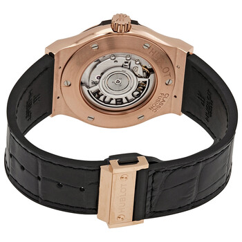 18kt rose gold case with a black leather/rubber strap. Fixed 18kt rose gold bezel. Black dial with rose gold-tone hands and index hour markers. Dial Type: Analog. Date display at the 3 o'clock position. Hublot Calibre HUB1110 automatic movement with a 42-hour power reserve. Scratch resistant sapphire crystal. Round case shape. Case size: 42 mm. Deployment clasp. Water resistant at 50 meters / 165 feet. Functions: date, hour, minute, second. Additional Info: bezel set with 138 brilliant diamonds (0.89 cts). Luxury watch style. Watch label: Swiss Made. Item Variations: 542 OX 1180 LR 1104, 542-OX-1180-LR-1104, 542/OX/1180/LR/1104, 542OX1180LR1104. Hublot Classic Fusion Automatic Black Dial Men's 18kt Rose Gold Diamond Watch 542.OX.1180.LR.1104.