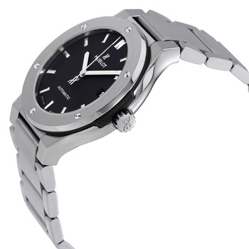 Grey titanium case with a grey titanium bracelet. Fixed grey titanium bezel. Black dial with silver-tone hands and index hour markers. Dial Type: Analog. Date display at the 3 o'clock position. Hublot calibre HUB1112 automatic movement, based upon Sellita SW300-1, containing 25 Jewels, composed of 63 parts, bitting at 28800 vph, and has a power reserve of approximately 42 hours. Scratch resistant sapphire crystal. Pull / push crown. Transparent case back. Round case shape. Case size: 45 mm. Band width: 20 mm. Fold over clasp with a push button release. Water resistant at 50 meters / 165 feet. Functions: date, hour, minute, second. Classic Fusion Series. Luxury watch style. Watch label: Swiss Made. Hublot Classic Fusion Automatic Black Dial Men's Watch 510.NX.1170.NX.
