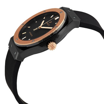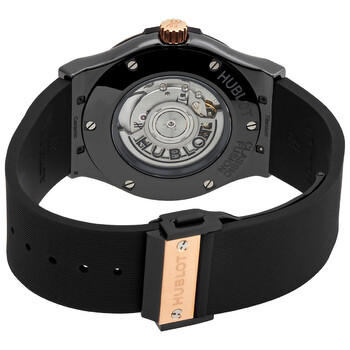 Ceramic case with a black rubber strap. Fixed 18kt rose gold bezel. Black dial with rose gold hands and index hour markers. Dial Type: Analog. Date display at the 3 o'clock position. Hublot Calibre HUB1112 Automatic movement, based upon Sellita SW300-1, containing 25 Jewels, composed of 63 parts, bitting at 28800 vph, and has a power reserve of approximately 42 hours. Scratch resistant sapphire crystal. Pull / push crown. Transparent case back. Round case shape, case size: 45 mm. Push button folding clasp. Water resistant at 50 meters / 150 feet. Functions: date, hour, minute, second. Classic Fusion Series. Luxury watch style. Watch label: Swiss Made. Hublot Classic Fusion Automatic Black Dial Men's Watch 511.CO.1181.RX.
