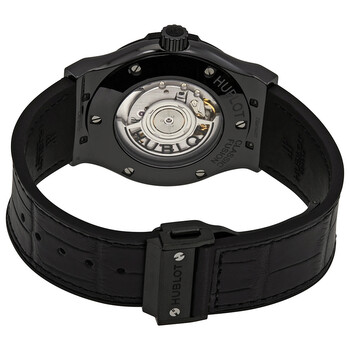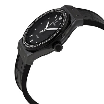 Black ceramic case with a rubber strap with a black leather inlay. Fixed black titanium bezel set with 138 diamonds. The bezel is set on a black resin ring (lugs). Black dial with silver-tone hands and index hour markers. Dial Type: Analog. Date display at the 3 o'clock position. Hublot caliber HUB1110 automatic movement, based upon Sellita SW300-1, containing 25 Jewels, bitting at 28800 vph, and has a power reserve of approximately 42 hours. Scratch resistant sapphire crystal. Pull / push crown. Transparent case back. Round case shape. Case size: 42 mm. Deployment clasp with a push button release. Water resistant at 50 meters / 165 feet. Functions: date, hour, minute, second. Luxury watch style. Watch label: Swiss Made. Hublot Classic Fusion Automatic Black Dial Men's Watch 542.CM.1171.LR.1104.