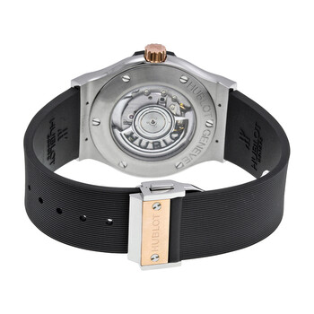 Zirconium case with a black rubber strap. Fixed 18kt rose gold bezel. Black dial with rose gold-tone skeleton hands and index hour markers. Dial Type: Analog. Date display at the 3 o'clock position. Hublot Calibre HUB1110 Automatic movement, based upon Sellita SW300-1, containing 21 Jewels, bitting at 28800 vph, and has a power reserve of approximately 42 hours. Scratch resistant sapphire crystal. Transparent case back. Round case shape. Case size: 42 mm. Band width: 22.5 mm, band length: 8 inches. Fold over with push button release clasp. Water resistant at 100 meters / 330 feet. Functions: date, hour, minute, second. Luxury watch style. Watch label: Swiss Made. Item Variations: 542 NO 1180 RX, 542-NO-1180-RX, 542/NO/1180/RX, 542NO1180RX. Hublot Classic Fusion Automatic Black Dial Men's Watch 542NO1180RX.